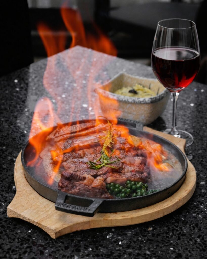 Ngay từ khoảnh khắc đầu tiên khi đĩa Steak được mang ra, sự chú ý của thực khách sẽ bị thu hút hoàn toàn bởi ngọn lửa xanh rực cháy trực tiếp tại bàn. Đây không phải là một sự phô trương hào nhoáng; đó là một kỹ thuật ẩm thực đầy dứt khoát để hoàn thiện hương vị cuối cùng cho miếng thịt bò thượng hạng. Ngọn lửa xuất hiện, bùng lên mạnh mẽ rồi vụt tắt, để lại một mùi hương nồng nàn, quyến rũ mà không một phương pháp chế biến trong bếp nào có thể thay thế được.